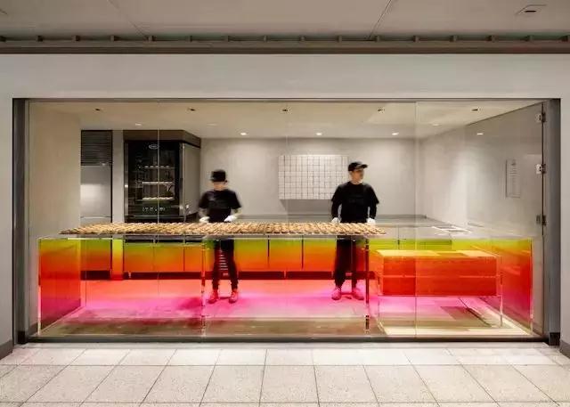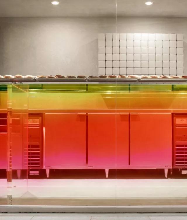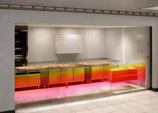 绚丽的灯光会丰富整个舞台的色彩,在 Bake Cheese Tart 北千住门店里,陈列台呈现半透明状,由黄绿到橙红色渐变,看着颇有舞台灯光的效果。