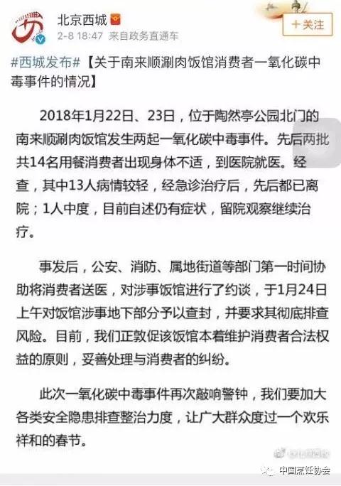2月8日,北京市西城区人民政府新闻办公室官方微博发布“关于南来顺涮肉饭馆消费者一氧化碳中毒事件的情况”称,2018年1月22日、23日,位于陶然亭公园北门的南来顺涮肉饭馆发生两起一氧化碳中毒事件。先后两批共14名用餐消费者出现身体不适,到医院就医。目前,我们正敦促该饭馆本着维护消费者合法权益的原则,妥善处理与消费者的纠纷。