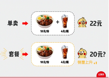 “比如东坡肉饭现在单卖是18元,可乐单卖是4元,我们把这两个产品组合成套餐卖20元。顾客就会觉得我只要再花2块钱就能买到一瓶超市里3块钱的可乐,然后每次来店里吃东坡肉饭的顾客都会点这个套餐。看起来的确是便宜了,但他们却忘了年前东坡肉饭是15元/份。”