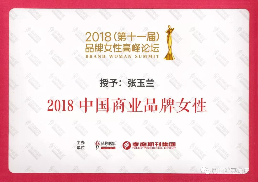 唐山鸿宴饭庄董事长张玉兰荣获“中国商业品牌女性”称号