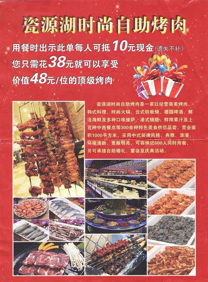瓷源湖时尚自助烤肉,持通吃卡抵10元现金
