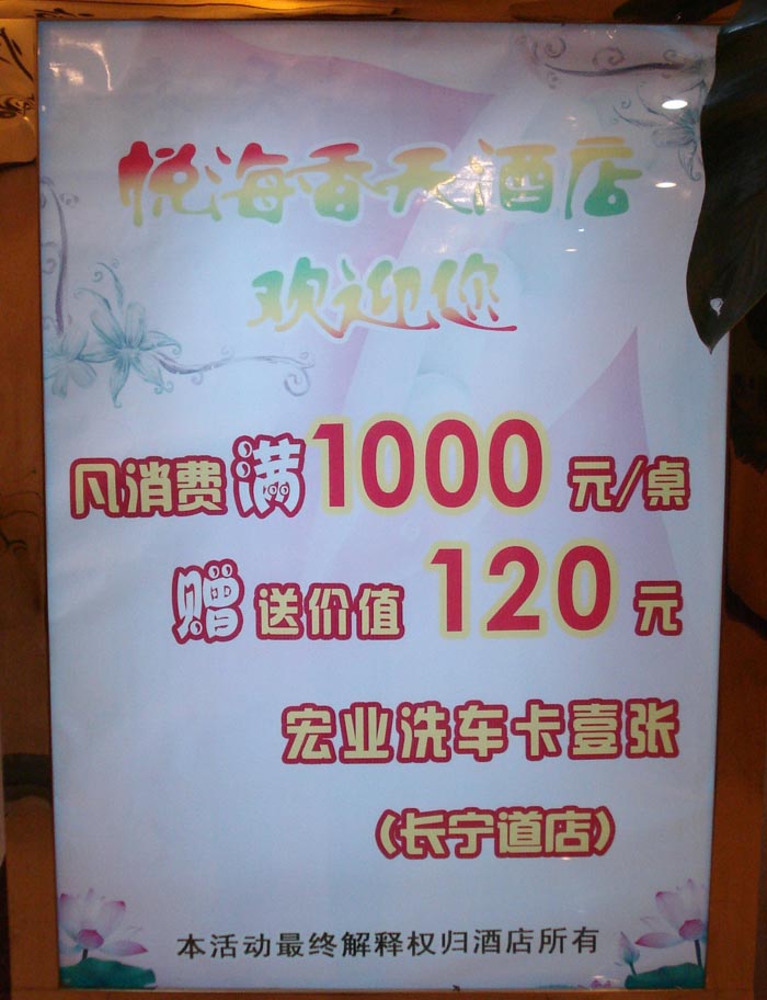 单桌消费满1000元,送价值120元洗车卡一张!
