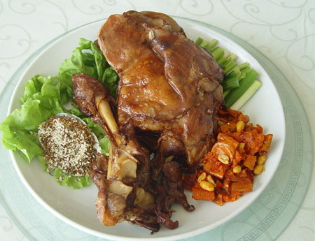 主料:山羊后腿1只…3000克, 姜末…30克, 甜面酱…20克, 黄瓜片…50克, 葱白段…80克, 烧饵…12个, 胡椒…5克, 盐…20克, 丁香…10颗, 味精…10克, 花生油…200克, 葱末…30克, 芝麻油…20克(图文)
