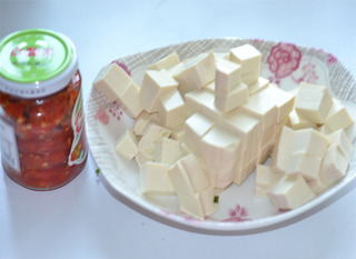 将豆腐切成小方块。