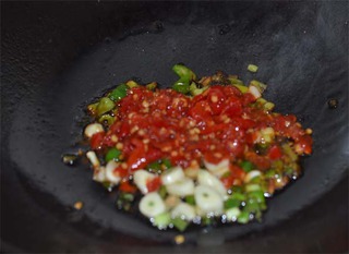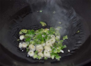 锅里倒油七八分放入葱蒜爆香。