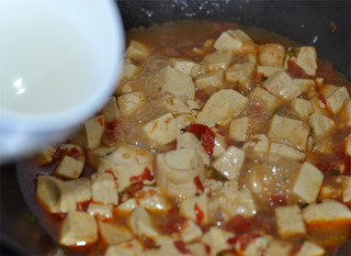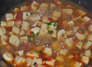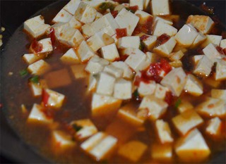 勺调成鱼香汁,待汤慢慢炖味入豆腐。