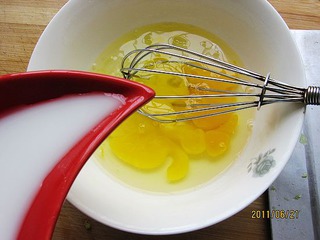 两个鸡蛋打入碗中,加入较稀的水淀粉搅匀。