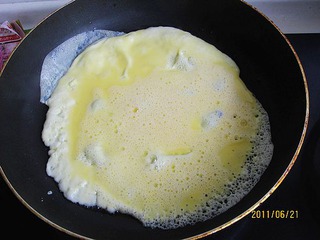 平底锅中刷少量油,倒入蛋液,煎成蛋饼。
