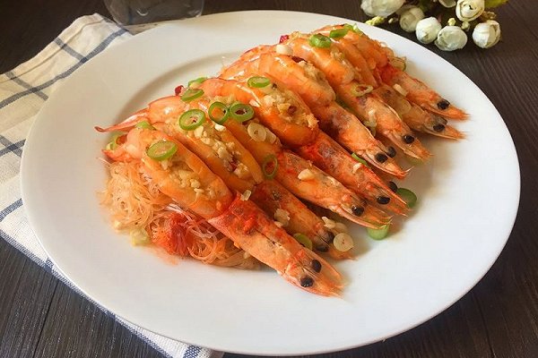6.将搅拌好的蒜末填进虾背处,粉丝垫于盘底,将虾放入,造型自己发挥吧!热水上锅蒸七分钟,焖两分钟