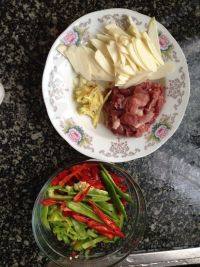 1.瘦肉洗净切片,茭白洗净切片,生姜切丝,辣椒切丝,要焯水哦。材料备用。