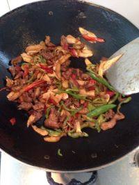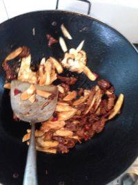 5.炒至瘦肉断生后飘香时,加入茭白片翻炒