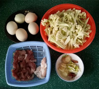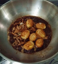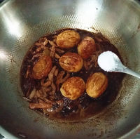 15.再重新倒入肉片、虎皮蛋和煸香的调料