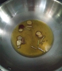 5.锅热后倒入菜籽油,爆香葱姜八角调料后盛出