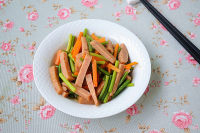 小贴士 1、烫蔬菜的时候可以先将胡萝卜烫至半熟再将蒜薹放进去,以免蒜薹烫的太软。 2、午餐肉稍微煎炒,口感更好。