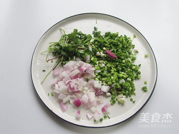 其中一面煎至稍微有脆底,撒入洋葱翻一下,即可入盘洒上香菜蘸调料汁,美美的食用了