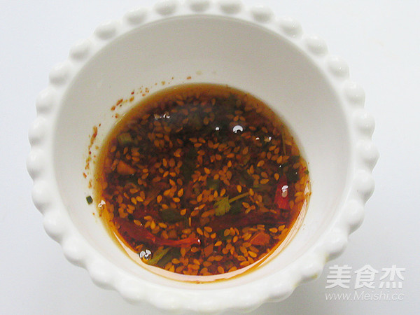 用热油浇辣椒面调成油辣子,加入少许醋、香油、盐调味做蘸汁