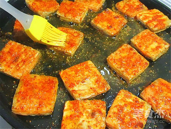 用油刷蘸上甜面酱,将每个臭豆腐均匀涂上甜面酱、撒点辣椒面再煎一会儿