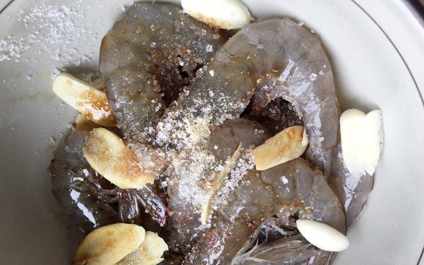 将腌制鲜虾的酱汁均匀倒在金针菇上,并撒上一勺蒜蓉油