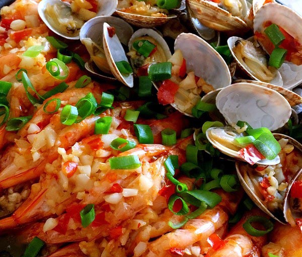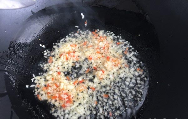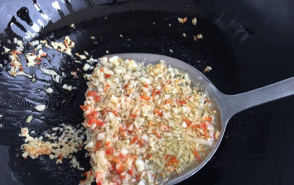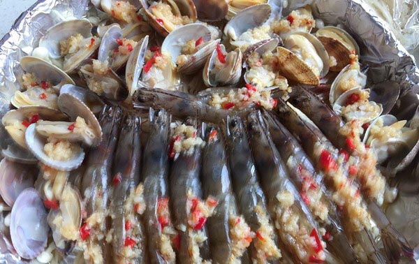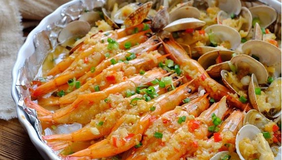 因为花蛤没有腌制,所以在剩余的蒜蓉油中加一点点盐,搅拌均匀,码到花蛤上