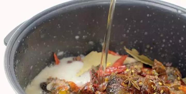 加入郫县豆瓣酱15g,白糖10g、生抽20ml、八角2个,花椒20粒、香叶3片、干辣椒5个