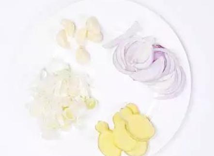 电饭煲中放入姜片6片、大蒜6瓣,葱花30g、洋葱丝100g