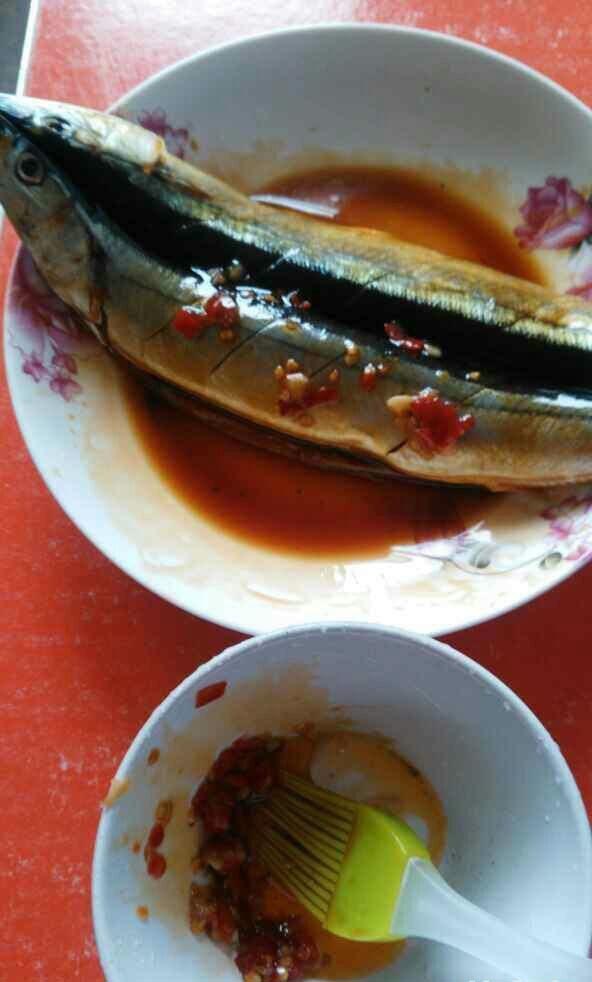 剁椒加花生油均匀的刷在鱼身上,腌制两三个小时