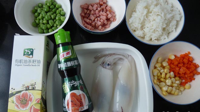 各材料除鱿鱼外均切小颗(米饭是用五常稻花香大米所煮的)