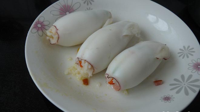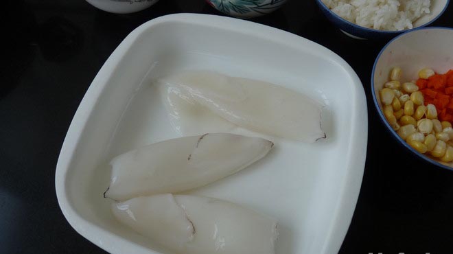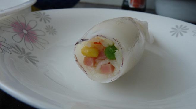 取鱿鱼,把炒过的饭塞在里面,尽量放多点材料在里面