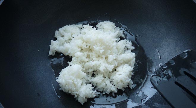 放点山茶油在锅里,烧热,下米饭炒一下