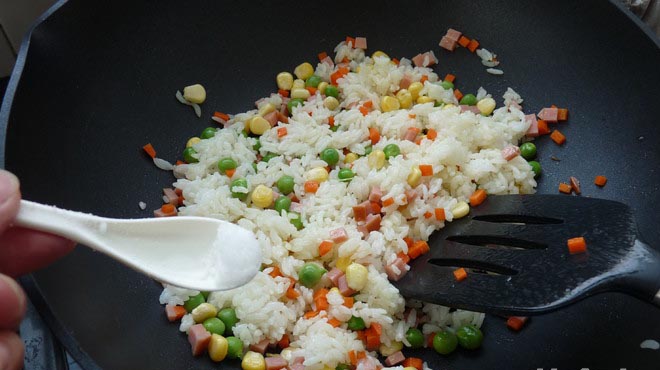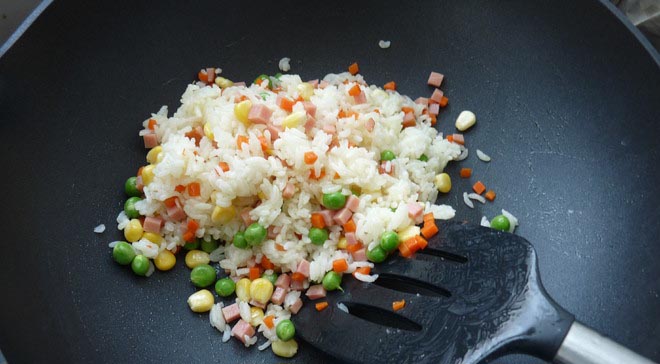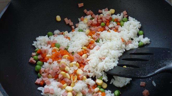 下青豆、火腿、红萝卜、玉米与饭一起,小火炒2分钟