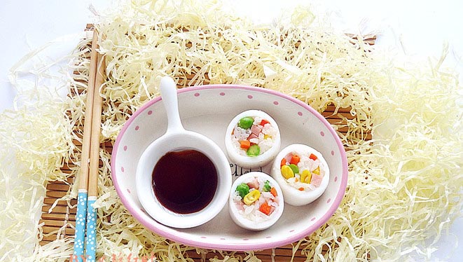 鱿鱼饭卷切件,取海鲜点蘸鲜露、山茶油放一小碟内,把鱿鱼饭卷蘸点食用