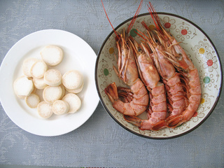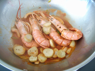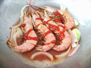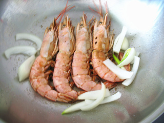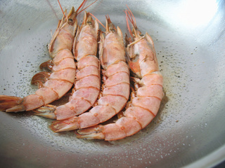 再加入少量橄榄油,将大虾抹少量盐煎至变色,翻面再煎至变色,约5分熟。