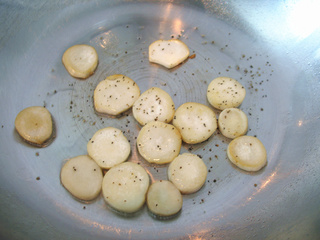 炒锅烧热加入少量橄榄油,将杏鲍菇煎至变色,撒黑胡椒面,盛出备用。