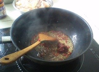 热油锅将姜蒜和朝天椒爆香 8、放入适量的郫县豆瓣 海鲜酱炒香