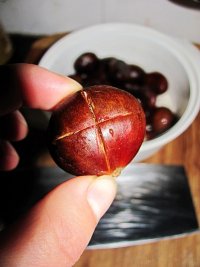 栗子洗净用刀在上面画出十字花痕,稍微深一点。
