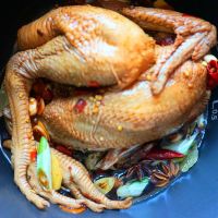 加一勺白糖,适量盐,料酒5勺,生抽5勺,老抽一勺,姜片、蒜片,干辣椒切段一起拌匀。用牙签在鸡身上扎眼按摩。