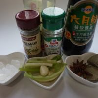 六月鲜酱油,料酒,黑胡椒粉,迷迭香,冰糖,葱蒜,八角,香叶备好。
