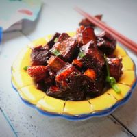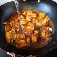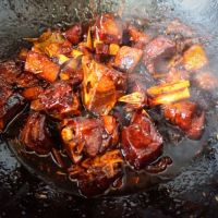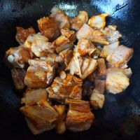 炒至汤汁变红褐色把控干水的羊排倒进锅里翻炒。