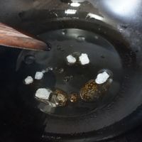 锅里倒入少许食用油、把冰糖放进去小火炒化。