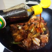 把所有的调料放进去,烹入料酒,六月鲜酱油一起翻炒。
