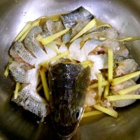 将鱼放入盆里,撒上生姜,盐,倒入料酒腌制8分钟。