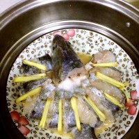 将腌制好的海鲈鱼连汤料一起倒入盘中,摆成孔雀开屏状,铺上姜丝;蒸锅水烧开后上锅蒸8分钟,关火。