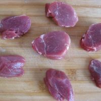 把猪里脊肉切成厚度1.5厘米,横截面为3—4厘米的厚片,在两面撒上很少的盐和黑胡椒初步调味。