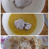 鸡蛋打散,把没一块切好的猪排裹一层干淀粉,然后拖蛋液,最后裹上一层面包糠