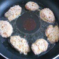 平底锅里放入稍微多一点的植物油烧热,下入裹好面包糠的猪排,转中小火煎至两面金黄