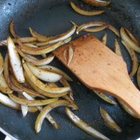 洋葱切丝,锅里留一点底油,下入洋葱炒软,加入一勺第二步中煮好的酱汁