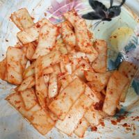 将萝卜皮倒入搪瓷盆中,放入少许韩式辣椒酱