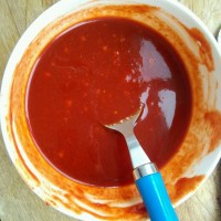 调制酱汁。蒜切成蒜蓉,加入两大勺韩式辣椒酱。