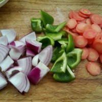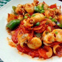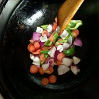 蔬菜炒至快熟,加入调好的酱汁,切件泡菜和墨鱼仔快速翻炒均匀。