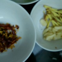 姜切丝,蒜切片,干辣椒剪成丝。